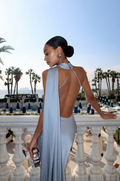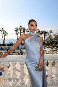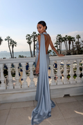 Deze opvallende jurk, uitgevoerd in een verfrissende zilverblauwe tint, combineert een gestructureerd crêpe lijfje met een luchtige, geplooide chiffon rok. De verlaagde taille en asymmetrische zoom zorgen voor een moderne touch, terwijl de meegeleverde chiffon sjaal een zachte, vrouwelijke touch geeft. Perfect voor tuinfeesten, formele evenementen of feestelijke gelegenheden.