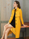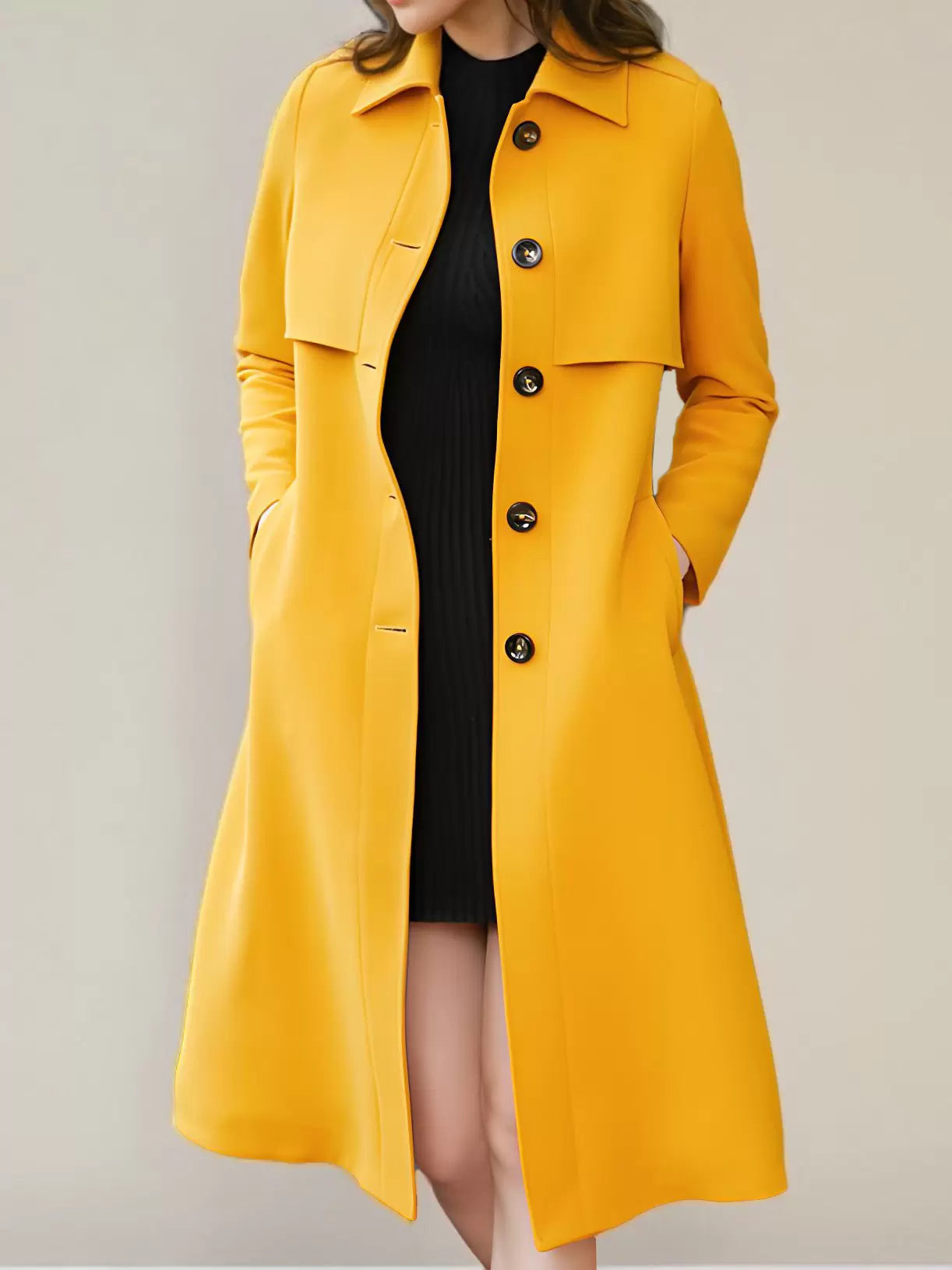 Omgeslagen kraag: De stijlvolle omgeslagen kraag voegt een verfijnde toets toe aan het silhouet van de jas en versterkt de geraffineerde uitstraling.