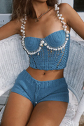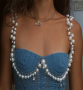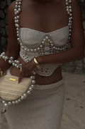 Dit cropped tanktopje is gemaakt van ingewikkeld, hol haakwerk met een delicate parelrand langs de sweetheart-halslijn. Met een vrouwelijke striksluiting op de rug en een hartvormige kraag is het het ideale statement piece voor zonnige uitstapjes en zomerse uitstapjes.