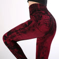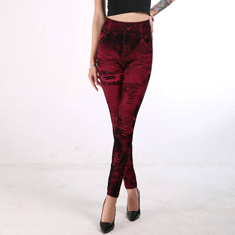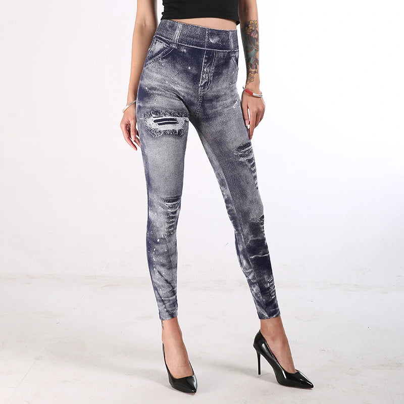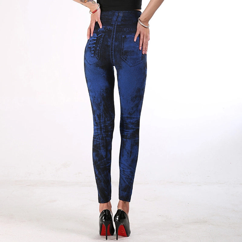 - Denim-geïnspireerde look : Deze leggings imiteren de look van jeans met een hoge taille, met details zoals nepzakken, naden en een knoopsluiting. Zo heb je de stijl van jeans, maar het comfort van leggings.