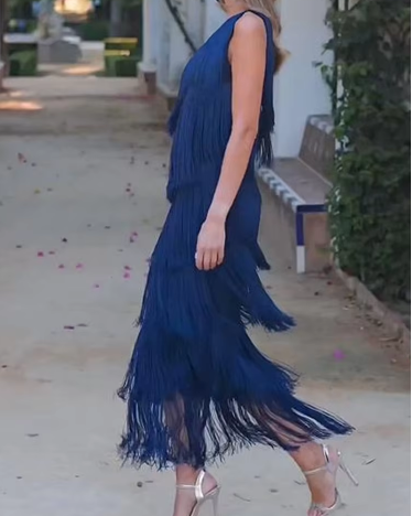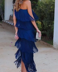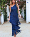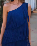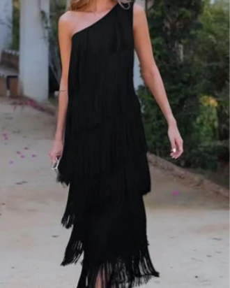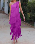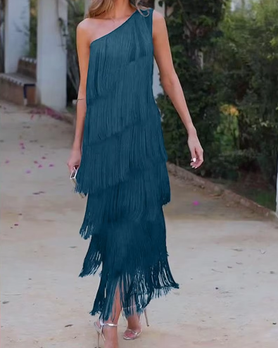 • Detail: One-shoulder neckline, full-length fringe layers, maxi length, side zip closure