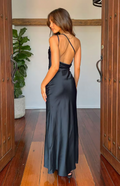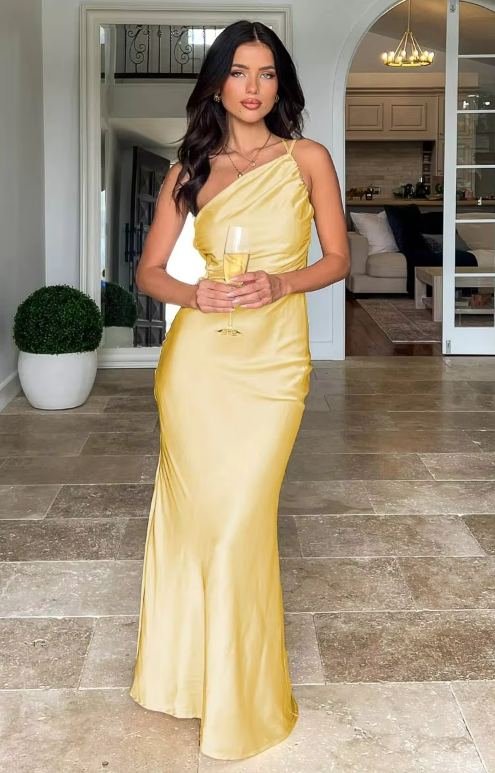 This is our Asymmetric Satin Drape Gown