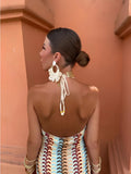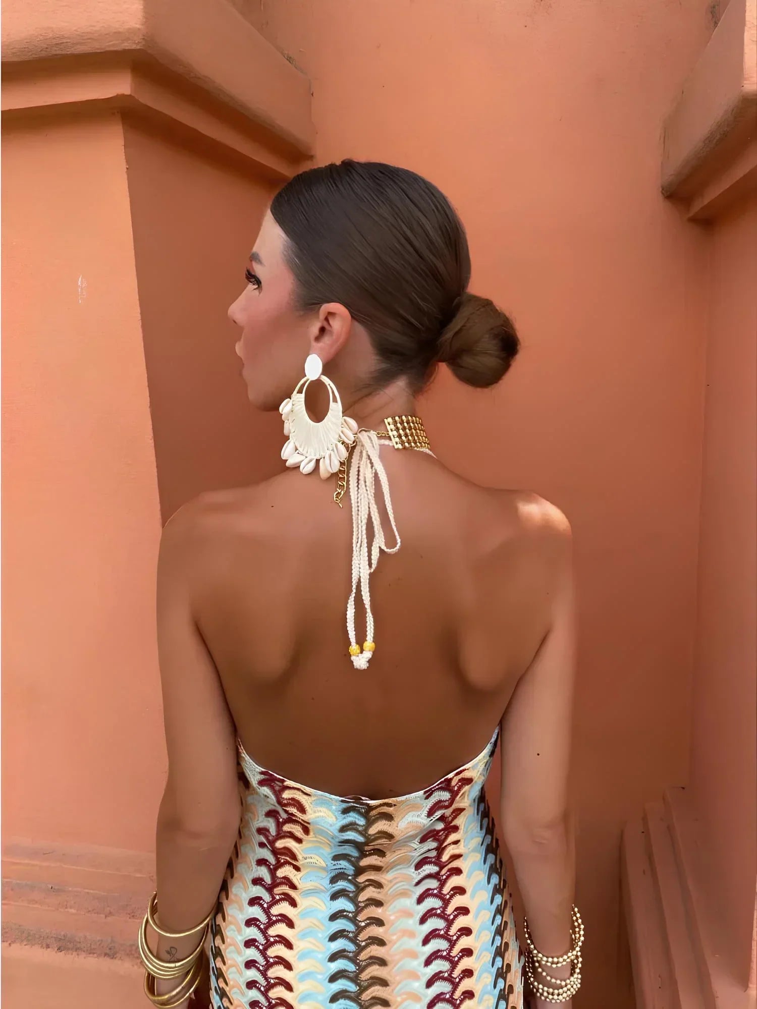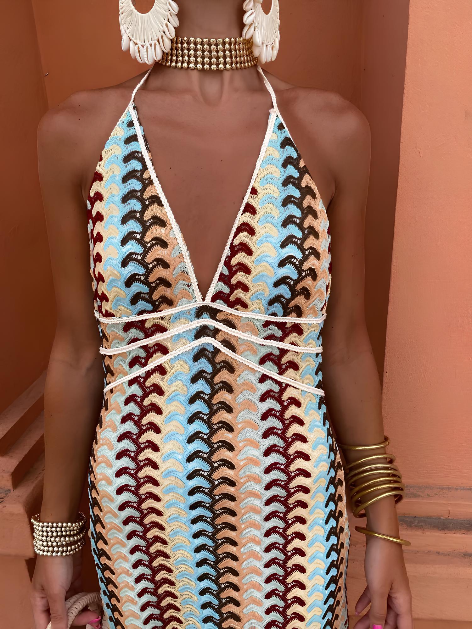 • Detail: Halter neckline, all-over chevron print, maxi length, tie-back closure