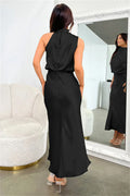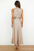 Effortlessly chic — this satin midi dress features a sophisticated halter neckline and flowing drape for an elevated look.