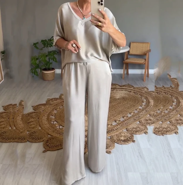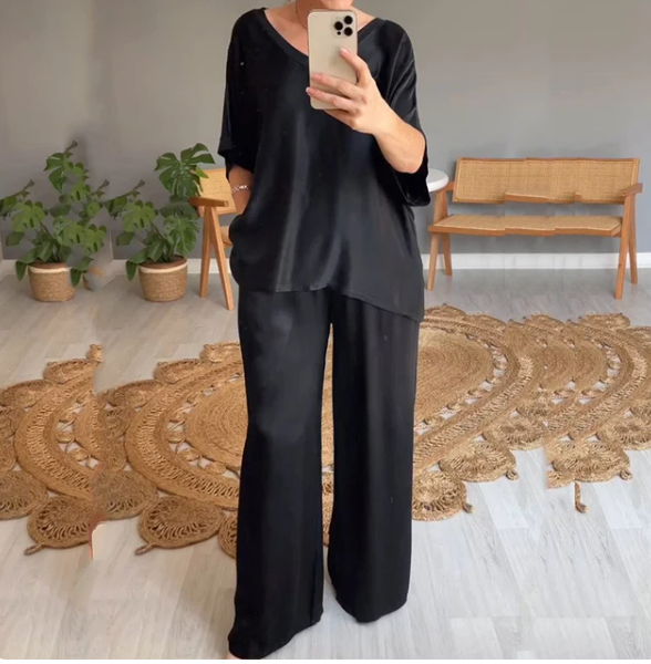 A luxurious and elegant ensemble designed for sophisticated comfort. This coordinated set features loose-fitting satin pants and a matching top, exuding effortless style and glamour.