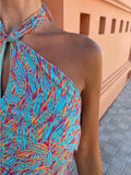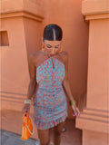 • Detail: Keyhole cutout, halter tie-back, mini length, back zip closure