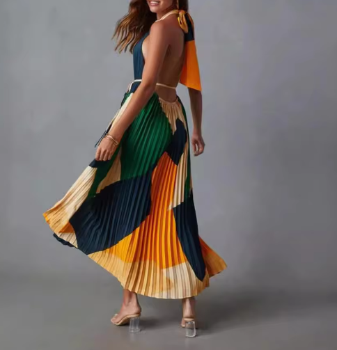 This is our Pleated Halter Tie-Waist Maxi Dress