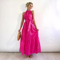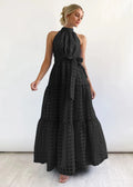 Playful yet refined — this halter maxi dress features a sheer grid-textured overlay, a belted waist tie, and soft tiered volume for an effortlessly romantic finish.