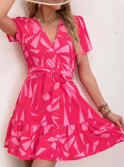 A chic blend of bold abstract print and a flattering wrap silhouette — this dress is perfect for making a statement with ease and elegance.